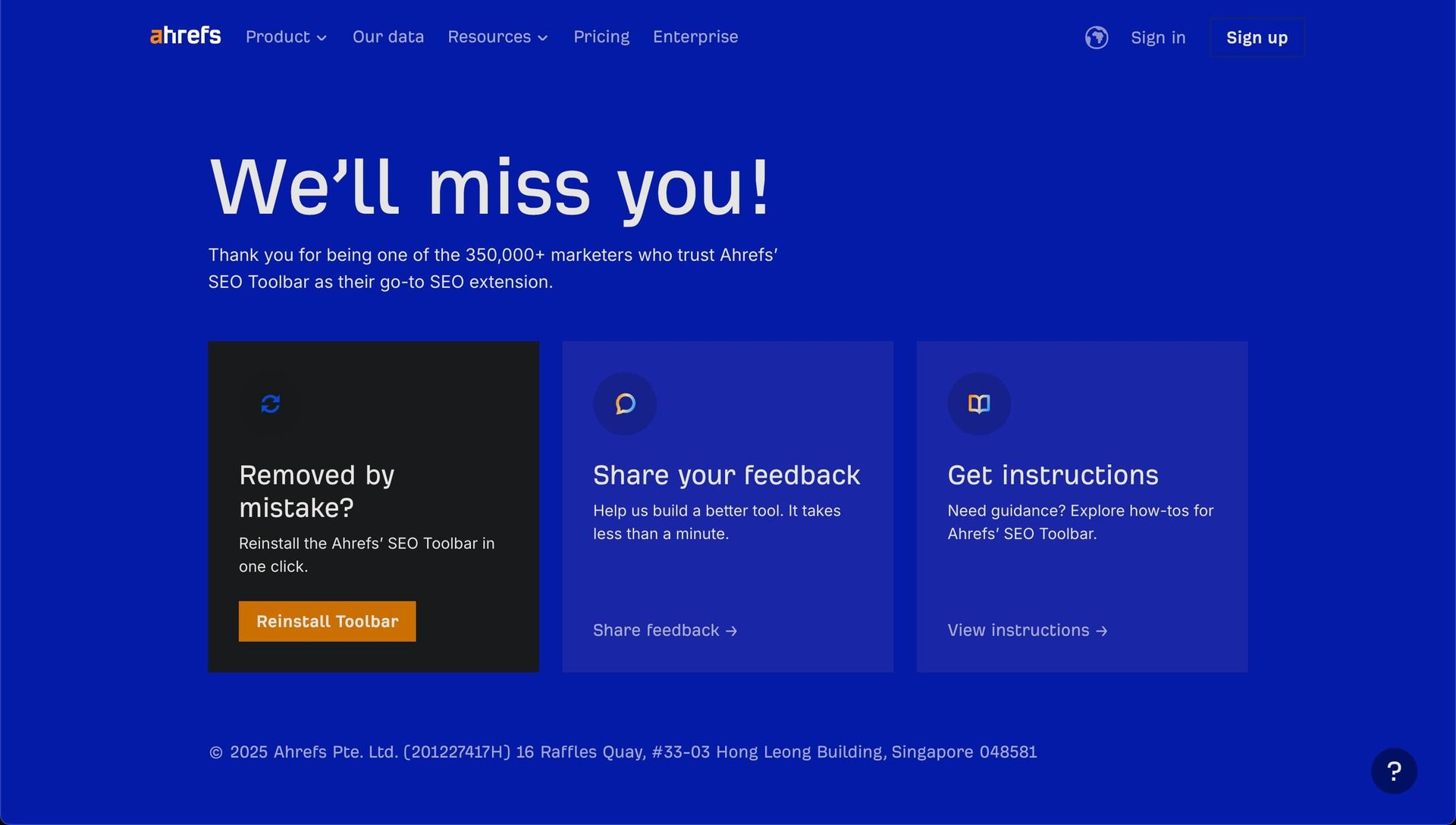 Ahrefs' chrome extension uninstall survey isn't a survey at all. It is a landing page that gives users 3 doors: a way back in, a way to be heard, or a way to learn.