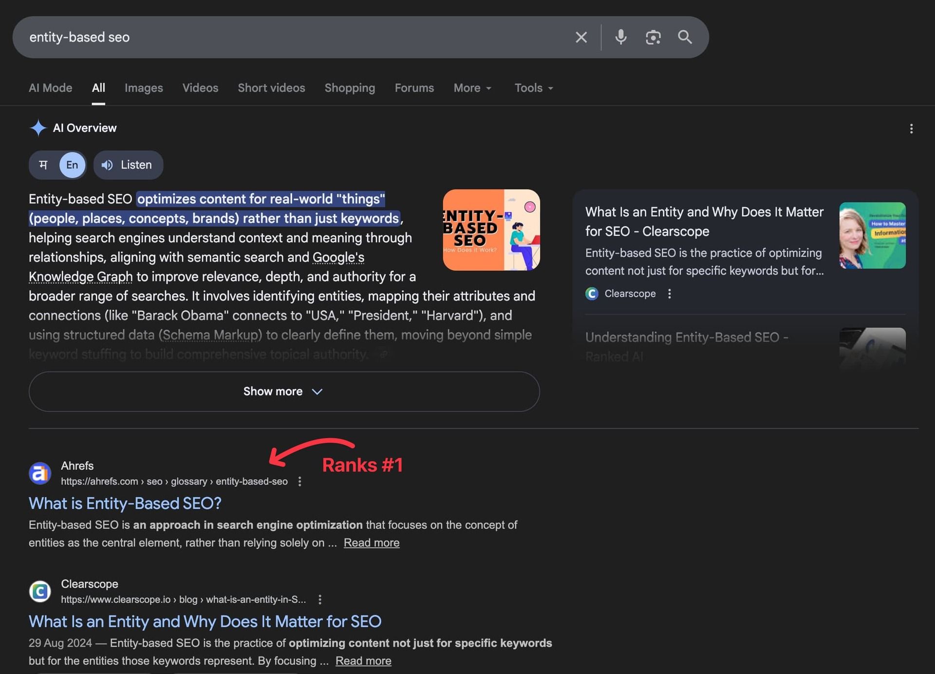 Google rewards them with free traffic. When you search for entity-based SEO, Ahrefs owns the top spot.