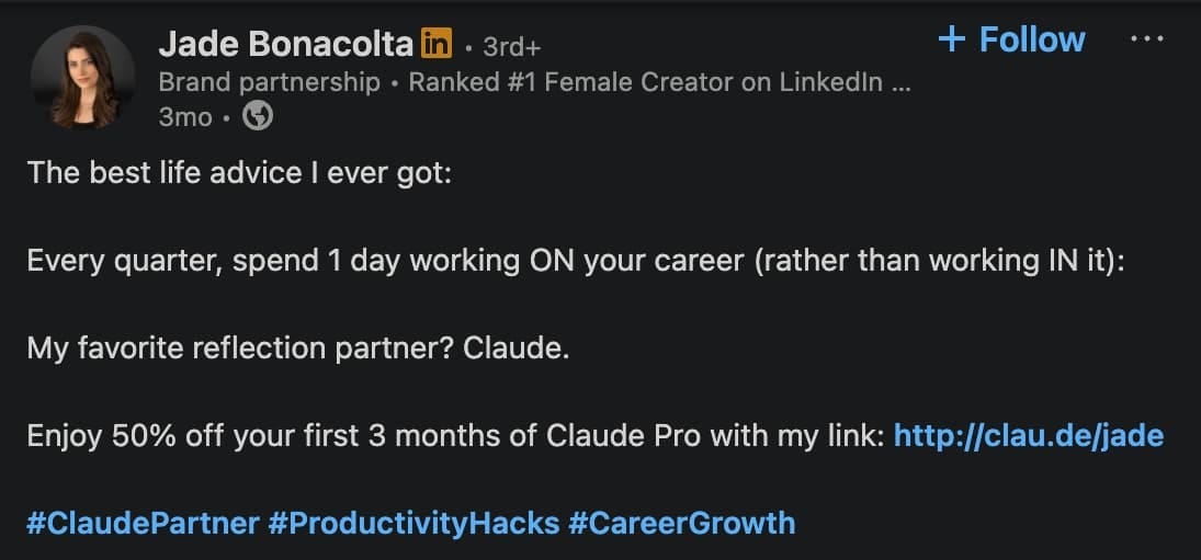Take Jade Bonacolta. She's ranked as the #1 Female Creator on LinkedIn. Her post about using Claude for quarterly offsites? It includes the hashtag. The pitch is subtle, personal, and real.