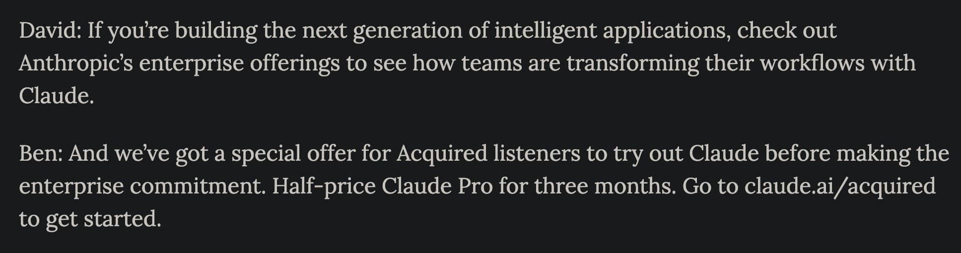 The Acquired podcast episode on Alphabet Inc. offered listeners half-price Claude Pro via a custom link at claude.ai/acquired. The hosts integrated the offer naturally into their conversation about enterprise workflows.