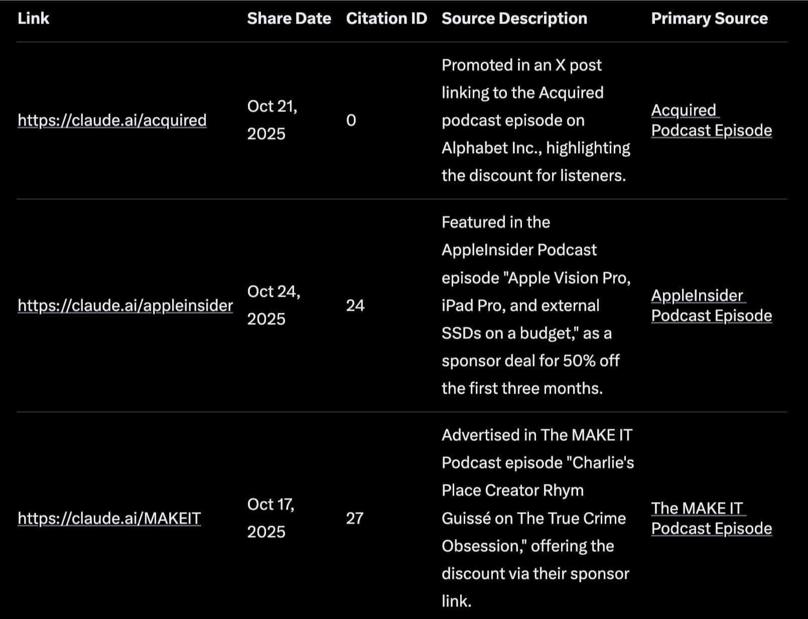 Each partnership gets its own tracking link. This lets Claude measure exactly which podcasts and influencers drive conversions.