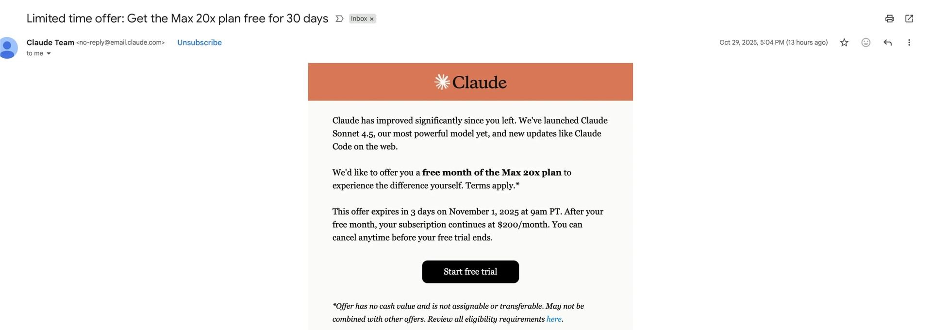 Existing subscribers pay full price while Claude courts those who left. The terms make it clear: "Existing paid subscribers are not eligible."