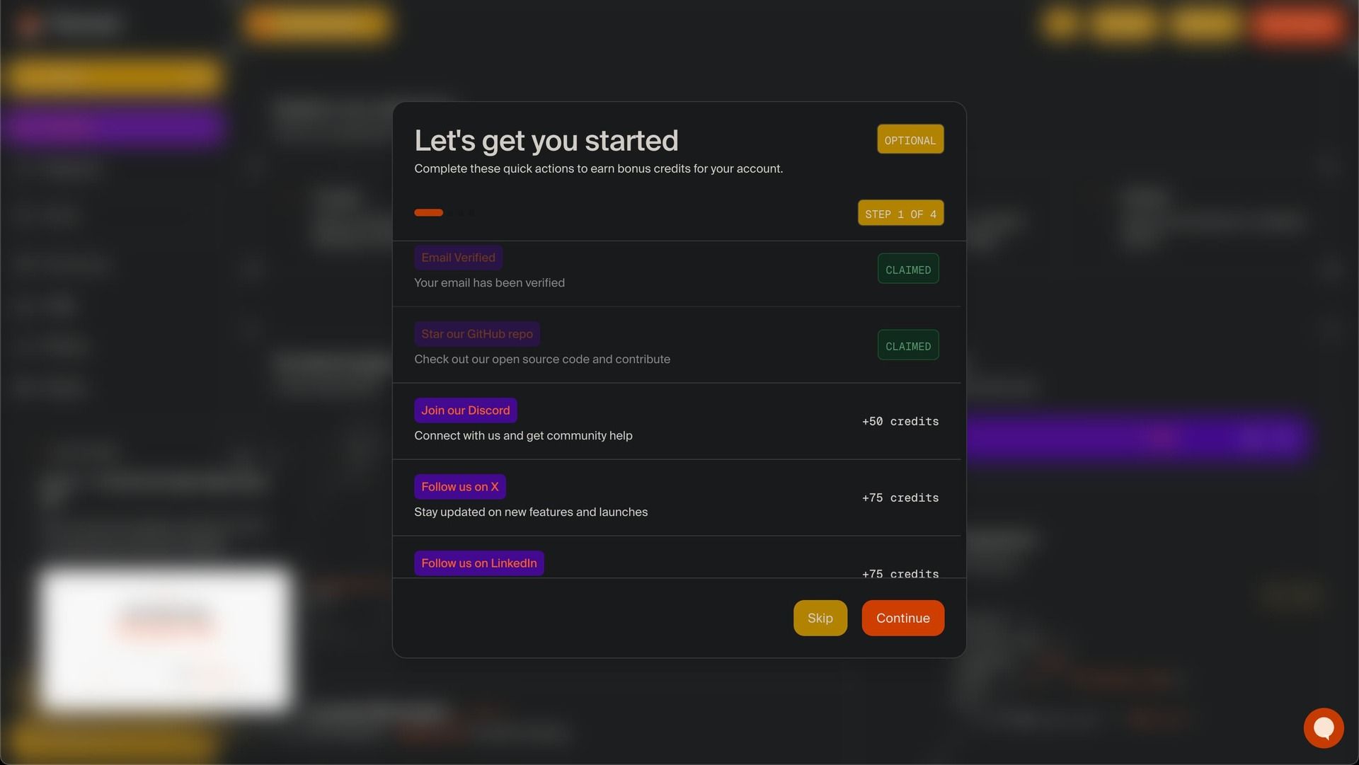 During onboarding, FireCrawl offers bonus credits. Join Discord, earn 50 credits. Follow on X, grab 75. Follow on LinkedIn, another 75.