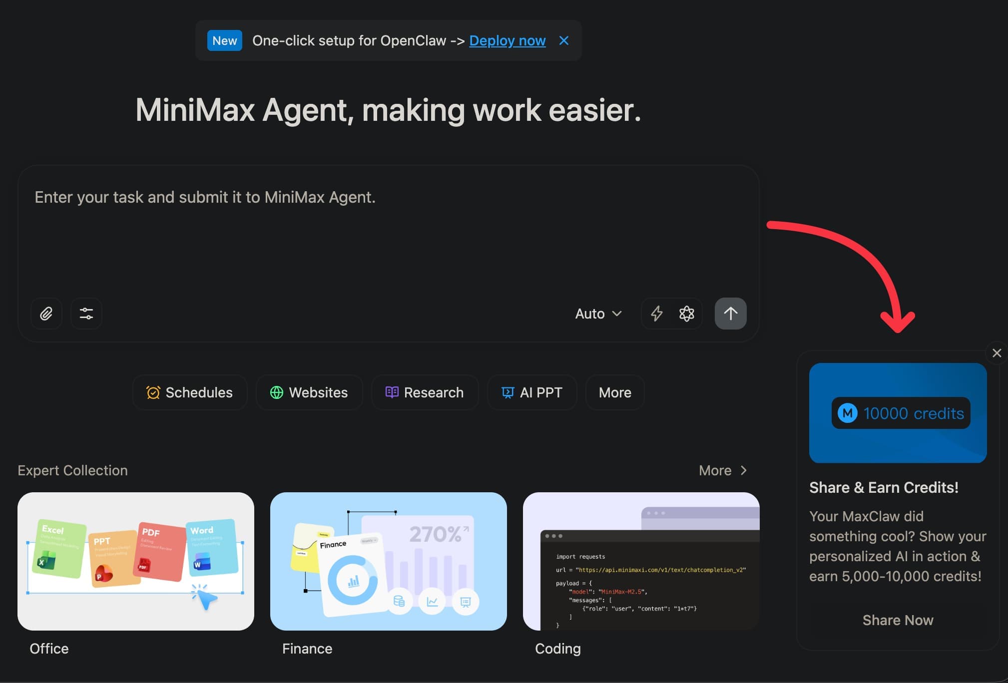 MiniMax lets users share and earn credits through the MaxClaw Showcase Program banner showing 10,000 credits reward