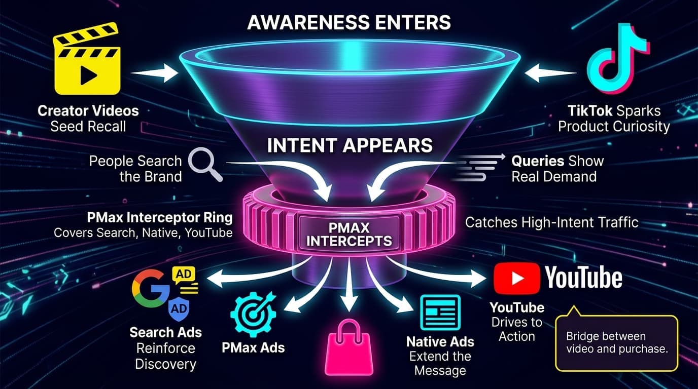 Neurogum runs Google Performance Max campaigns to intercept it. PMax targets search, native ads, and YouTube all at once. It captures anyone who saw a creator video and then went looking for more.