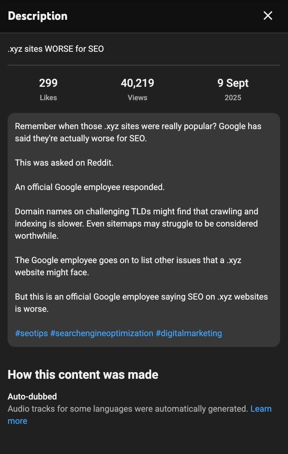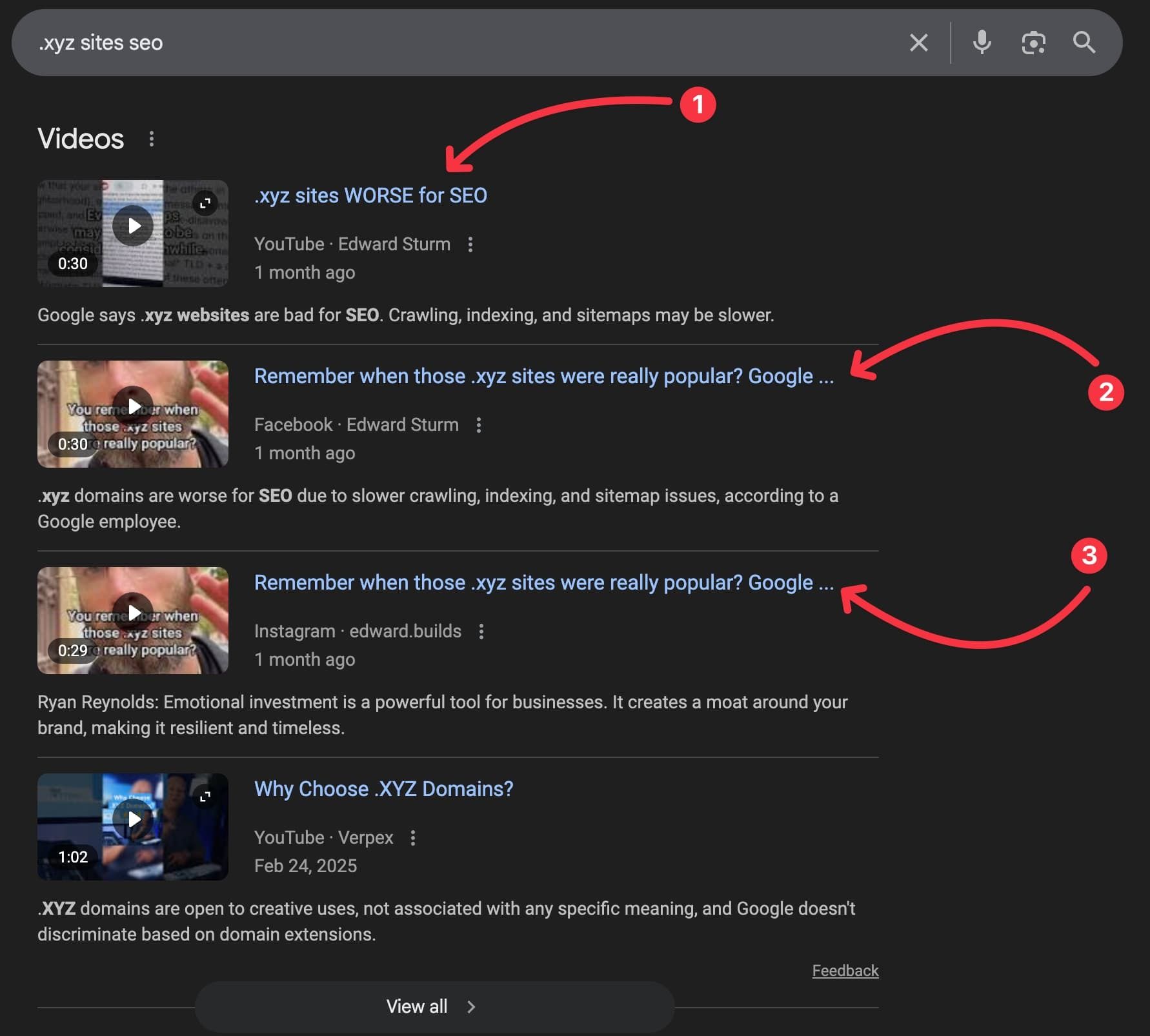 Search for .xyz sites SEO on Google. You'll find YouTube, Instagram, and Facebook all ranking the same videos by Edward Sturm. The description and title drive these rankings.