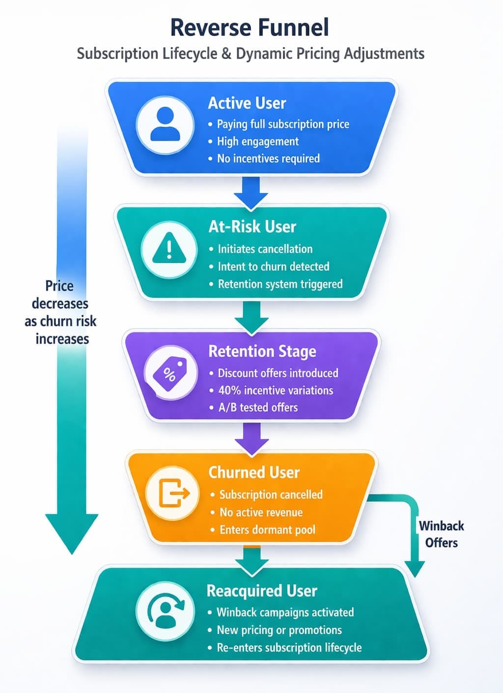 A visualization of the reverse funnel showing how pricing changes as users move from active to churned and then reacquired