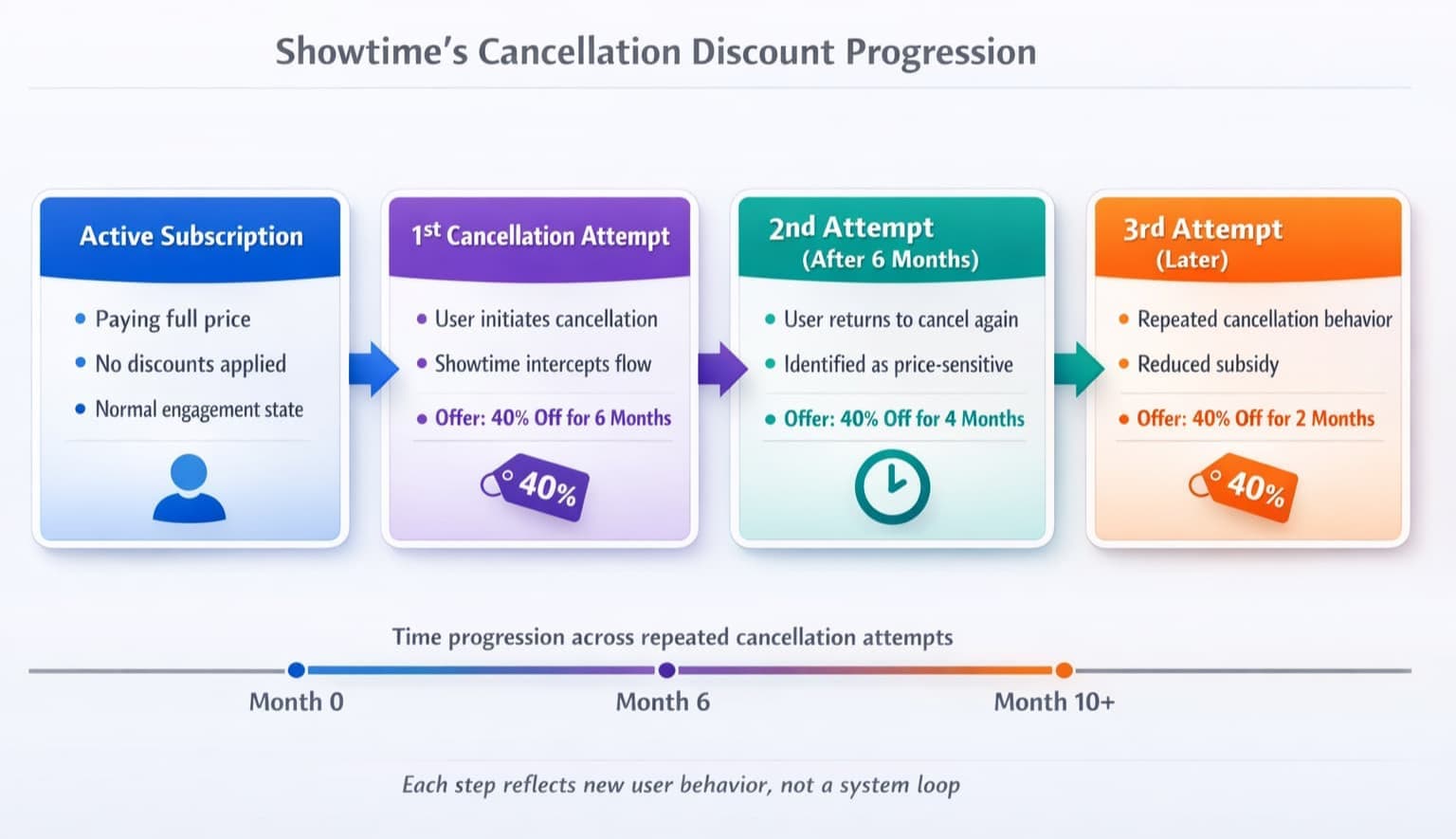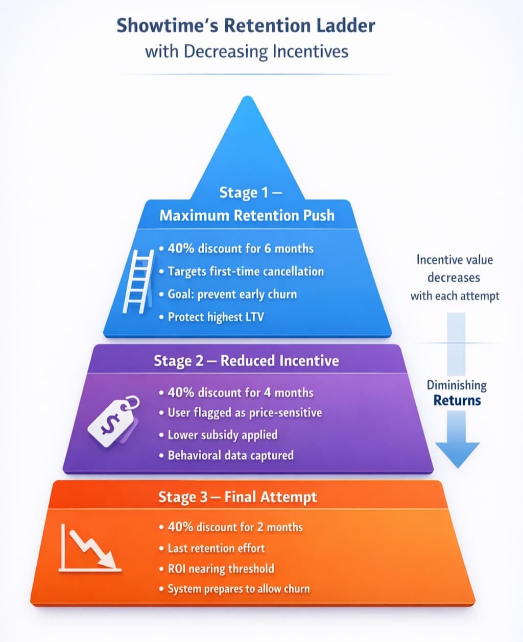 The Showtime ladder is a way to bridge these 2 worlds. It uses a high-incentive offer to stop immediate churn, but then systematically scales it back. The goal is to move the user back toward full-price profitability rather than letting them hide in a low-value discount loop forever.