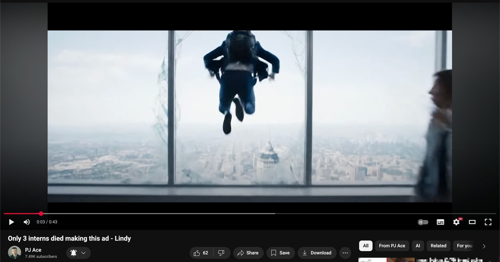 Viral AI ad hook showing a worker jumping from a skyscraper