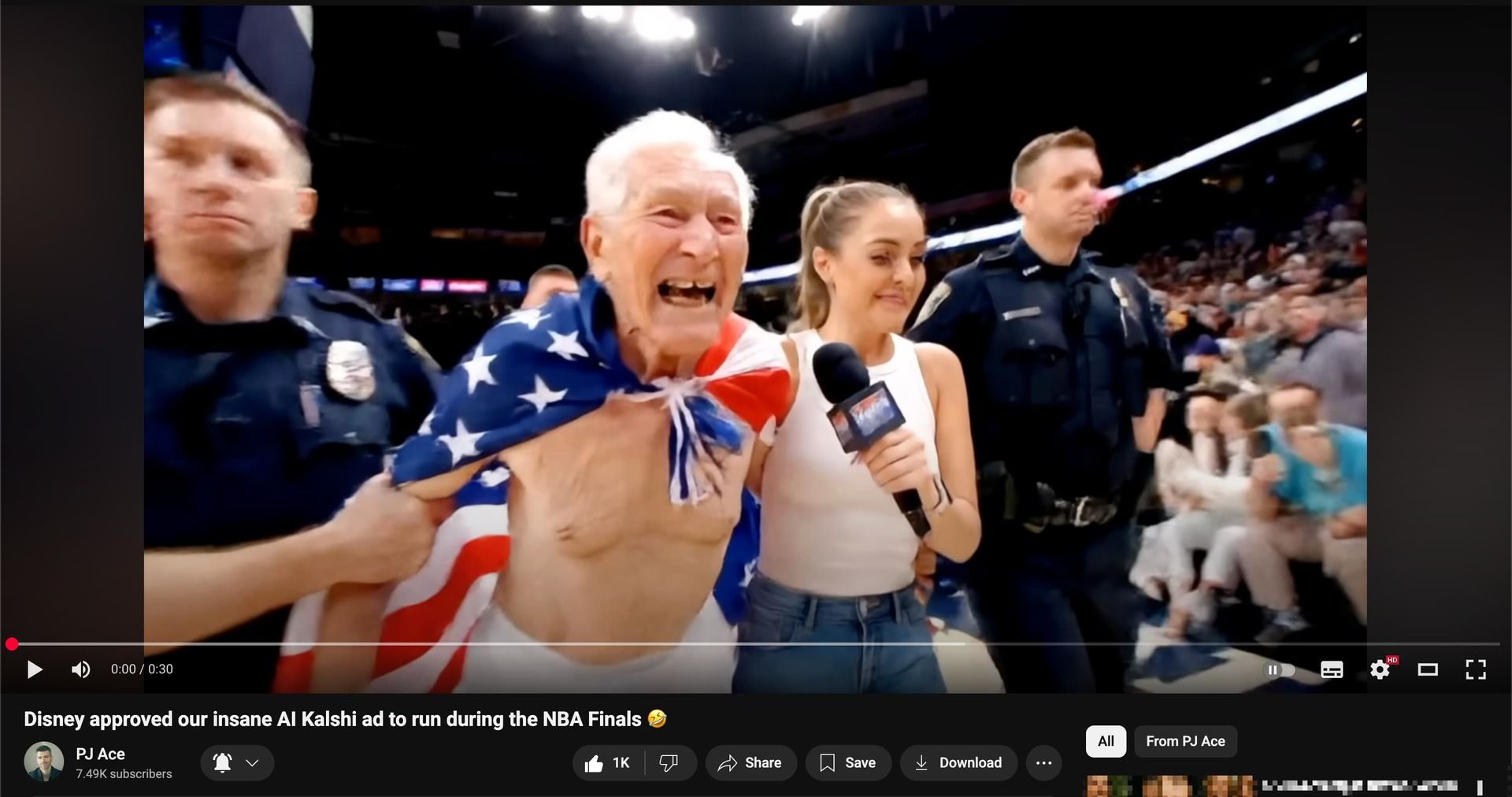 For the Kalshi ad, this meant opening with a 90-year-old man in underwear being arrested while wearing an American flag.